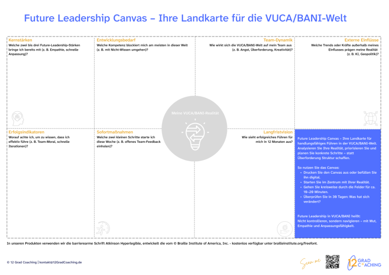 Das Future Leadership-Canvas bringt Klarheit in Ihre aktuelle Führungsrealität – strukturiert und auf einen Blick.